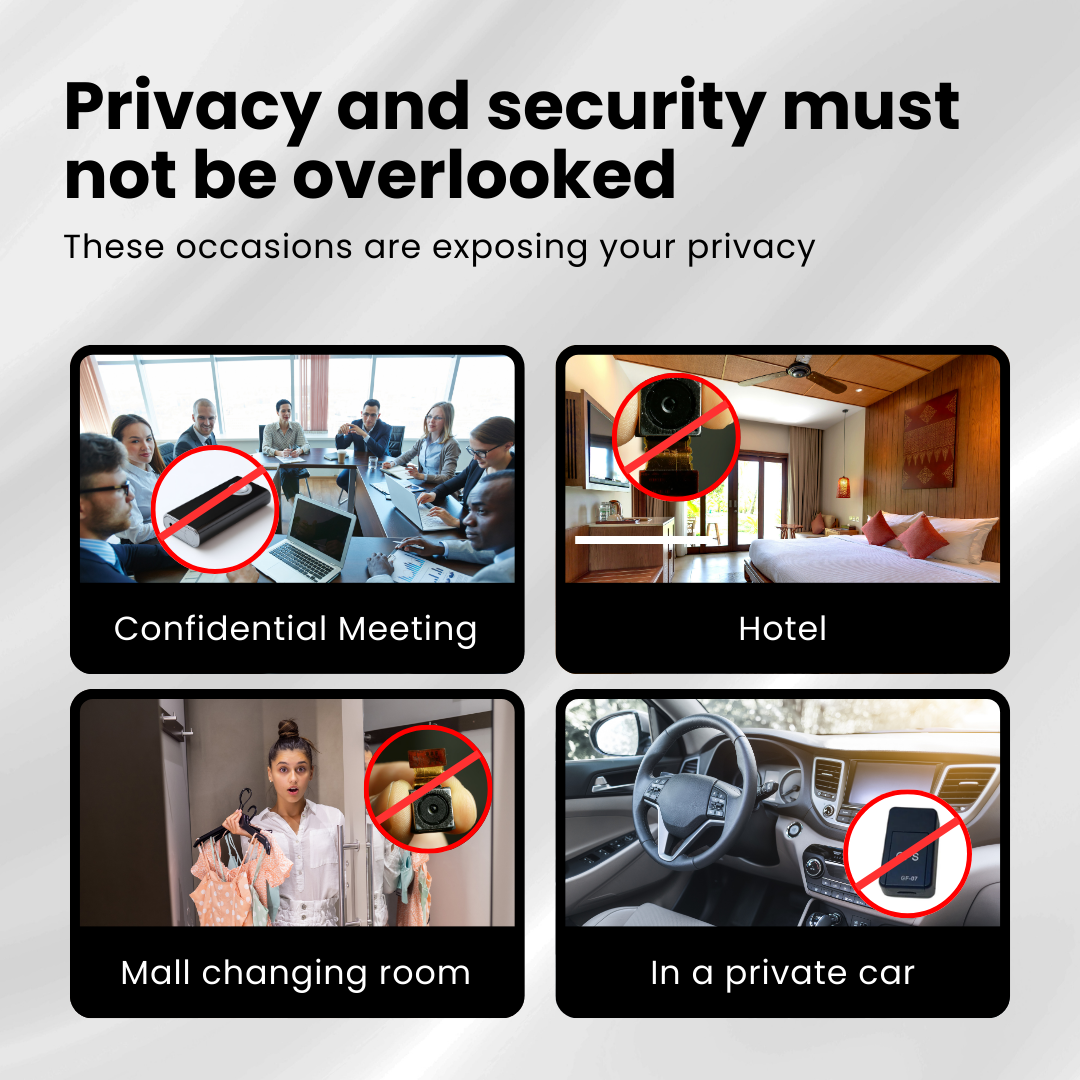 Scan hotel rooms, bathrooms, and shared spaces to ensure your surroundings are safe from spying.